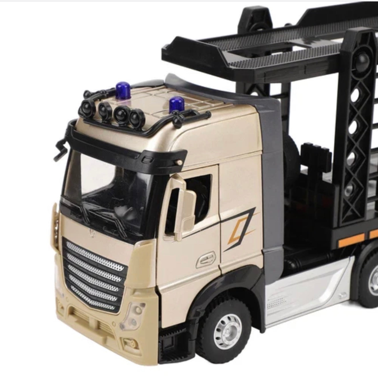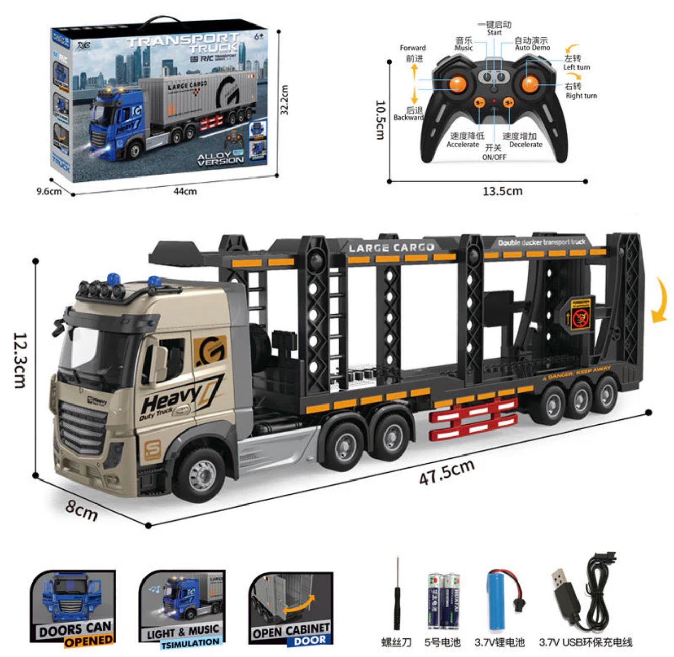Crafted from diecast metal with plastic parts, the truck is durable and built to last, while the double-layer cargo design adds authenticity for imaginative play. Kids can explore the openable front doors, enjoy cool LED lights and dynamic music, and control every move with the full-function 2.4GHz remote control—forward, backward, left, and right with precision.